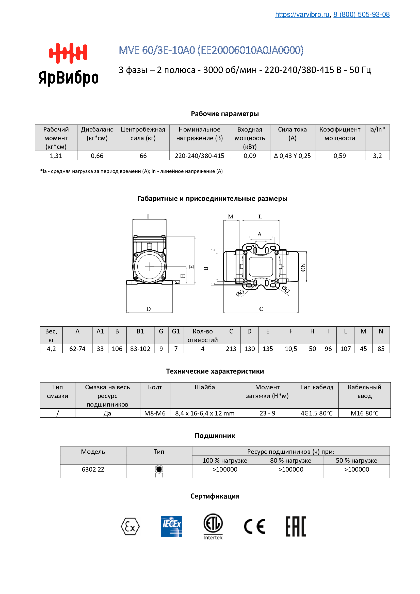 | Ресурс подшипников (ч) при | 100% - >100000 80% - >100000 50% - >100000 |